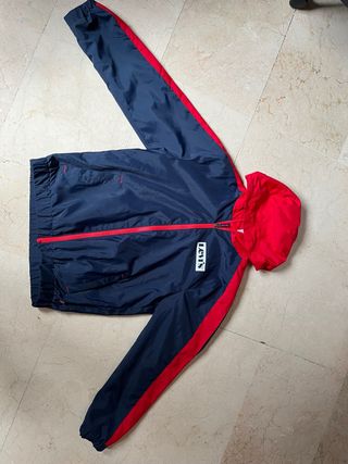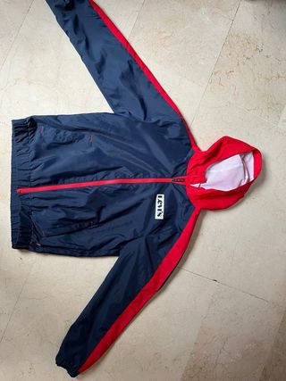 Giubbotto antivento con un design moderno e sportivo. Taglia 14A 164cm - Combinazione di colori blu navy e rosso. Chiusura con cerniera frontale. Cappuccio integrato. Dettaglio del logo sul petto.