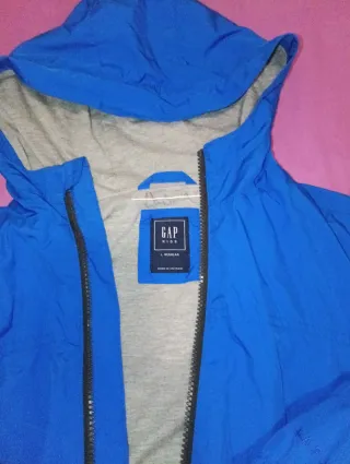 Giubbotto antivento per bambini della marca Gap. Ideale per proteggere dal vento e dalla pioggia leggera. Design con cappuccio. Chiusura con zip frontale. Fodera interna in maglia. Prodotto in Vietnam. Giubbotto usato, con segni d'uso. Non è rotto. Cerniere completamente funzionanti.