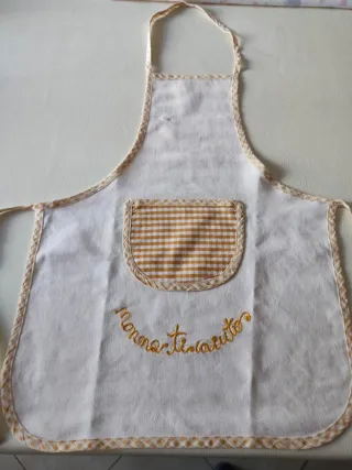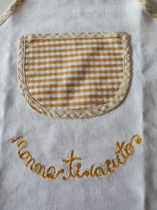 Un adorabile grembiule per adulti e bambini, perfetto per le piccole attività creative o in cucina. Presenta una pratica tasca frontale. Lunghezza 57 larghezza 44 Ha un piccolissimo rattoppo sulla pettorina - Decorato con ricamo Mamma ti amo. - Bordi rifiniti con fantasia a quadretti.