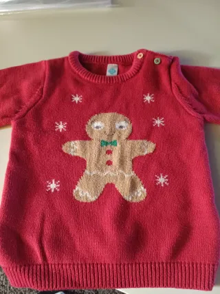 Adorabile maglione natalizio per i più piccoli, con un divertente design di biscotto di ginger. Perfetto stato. - Tessuto morbido e caldo. - Stampa di biscotto di ginger sul davanti. - Dettagli di fiocchi di neve. - Chiusura con bottoni sulla spalla per facilitarne l'indossamento.