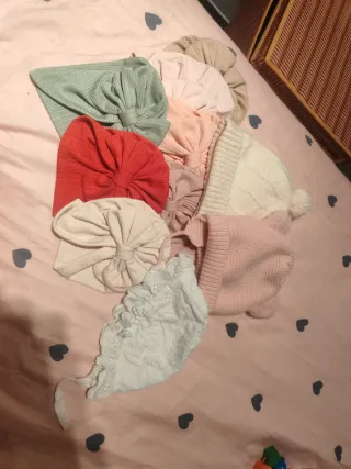 Set di accessori per la testa del bambino, perfetti per completare qualsiasi abbigliamento. - Diademi a turbante con fiocco. 7 - Cappelli di maglia con pompon e orecchie 2 - Un cappellino bianco in pizzo con volant estivi 1