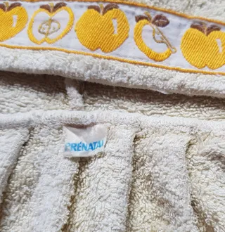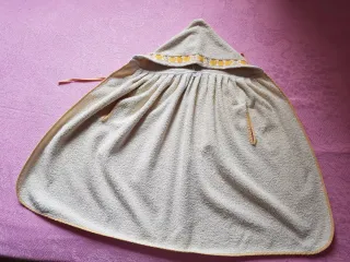 Capa da bagno morbida e comoda per neonati, con un design a cappuccio. Materiale a riccio assorbente. Bordo decorativo in giallo. Chiusura con cordoncino.
