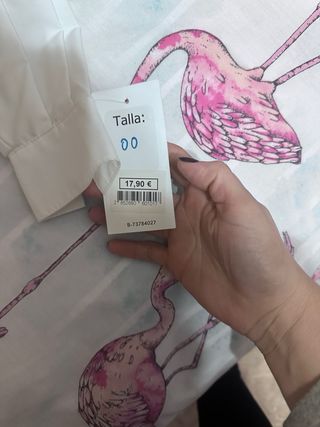 T-shirt a manica lunga di colore grigio azzurro con stampa di fiocchi. Collo color blu marino. La parte posteriore ha un'apertura a lacrima con chiusura a bottone. Marca: Kiabi. Taglia: M