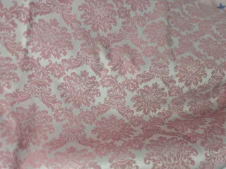 Tessuto con un bel motivo floreale in toni rosa e bianchi. Ideale per la confezione di abbigliamento per neonati o bambini piccoli. - Design damasco. - Tessuto di qualità. Misure: 70 cm di altezza x 280 cm di larghezza. Include alcuni ritagli per fare dettagli o rivestire scarpe.