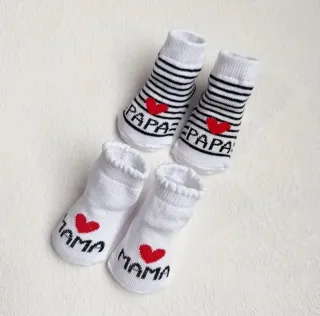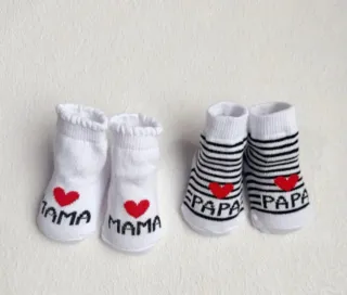 Set di due paia di calzini per neonati con divertenti disegni. - Un paio con righe nere e bianche e il testo PAPA con un cuore rosso. - Un altro paio bianco con il testo MAMMA e un cuore rosso.