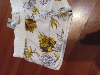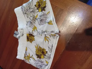 Pantaloncino sportivo da donna con un vivace motivo floreale. - Vita elasticizzata con coulisse. - Tessuto leggero e confortevole. - Design con fiori gialli e foglie su fondo bianco.