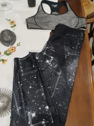 Set sportivo in due pezzi. - Reggiseno sportivo grigio con dettagli neri. - Leggings neri con stampa galattica e dettagli bianchi.