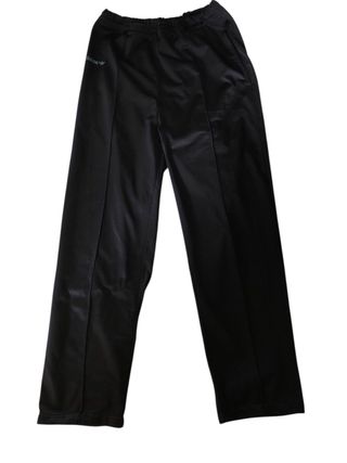 Pantaloni neri aderenti con un design sportivo. Dettagli a strisce argentate e bianche sui lati. Tessuto elasticizzato.
