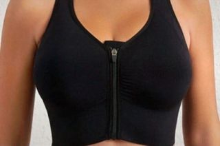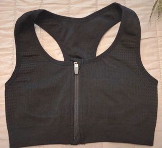 Reggiseno sportivo da donna nero, taglia S/M elasticizzato, con cerniera sul davanti e gancetti per stringere o allargare, molto comodo e adatto alla corsa e le attività sportive, usato poco - Tessuto elasticizzato. - Zip