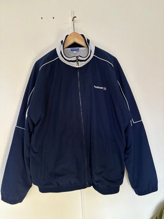 Giubbotto sportivo del marchio Reebok. Design in blu navy con dettagli bianchi. Collo alto con cerniera. Polsini e cintura elastici.
