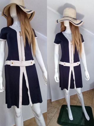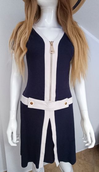 Vestito estivo sportivo blu e bianco con grande cerniera sul davanti, tessuto morbido ed elasticizzato, tg.38/40(verifica le misure in foto).