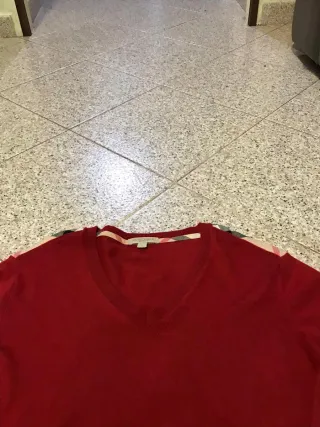 Maglione da uomo Burberry in lana, colore rosso con rifiniture in tartan, indossato poco e tenuto in ottime condizioni senza segni di usura adatto per uno stile sportivo elegante - Taglia S - Scollo a V - Dettagli iconici Burberry sulle spalle