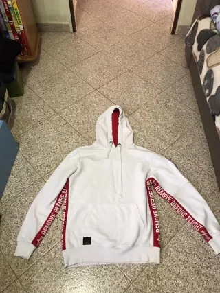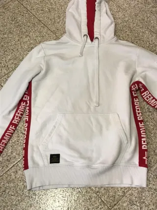 Felpa con cappuccio e dettagli rossi a contrasto,indossata poco e tenuta in ottime condizioni senza segni di usura adatta per uno stile sportivo e confortevole - Logo sul davanti. - Striscia REMOVE BEFORE FLIGHT sulle maniche. - Tasca a marsupio.