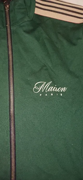 Felpa con zip Maison, un capo sportivo e alla moda. - Zip frontale. - Dettagli a righe sulle maniche e sul collo. - Logo Maison ricamato sul petto.