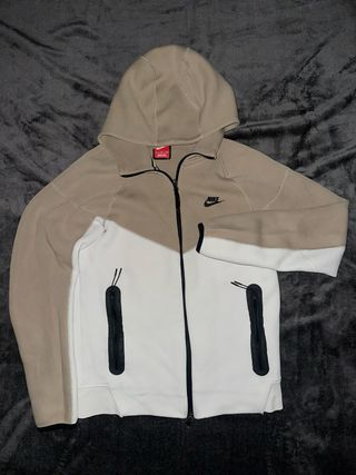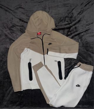 Completo Nike Tech in colorazioni beige e bianco. Perfetto per un look sportivo e alla moda. - Felpa con cappuccio e zip. - Pantaloni con coulisse in vita.