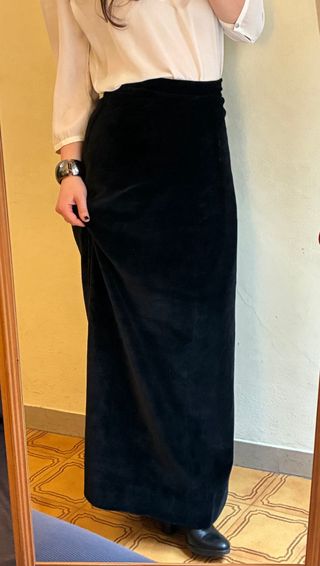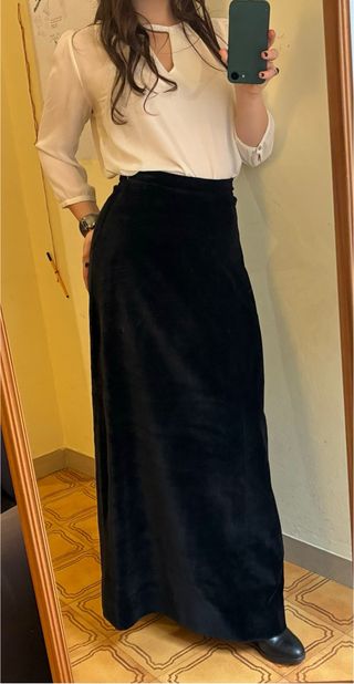 Ampia gonna nera vintage in velluto liscio. Taglio dritto leggermente a trapezio, vita alta. Foderata all’interno. Taglia L indossata da una taglia L 1,65. Chiusura laterale con zip funzionante e gancetti neri. Condizioni ottime, esattamente come in foto, non presenta imperfezioni. Vestibilitá morbida e comoda, elegante e confortevole. Misure in foto. Non presenta brand, né loghi o etichette. 😊🤍 Splendida e senza tempo.