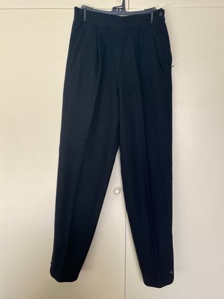 Eleganti pantaloni neri in lana da donna. - Tessuto in lana. - Taglio a carota, raffinato. - Dettaglio con bottone sul fondo gamba. - Chiusura laterale