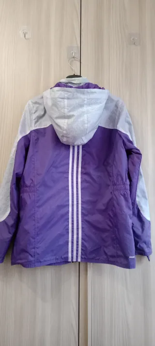 Splendida giacca a vento Adidas originale del 2011, linea Climaproof, perfetta per l'outdoor, il trekking o uno stile urban ricercato.Caratterizzata da un vivace contrasto cromatico viola e grigio con dettagli catarifrangenti e le iconiche 3 strisce verticali sulla schiena. Il capo è dotato di cappuccio, chiusura a zip con patta protettiva e tasche laterali con cerniera.Materiale tecnico resistente alle intemperie (Nylon/Poliestere). Condizioni: Buone condizioni generali. Si segnalano leggeri segni di usura all'interno del collo (non visibili quando indossata). Misure: Spalle: circa 42 cm Ascella-Ascella: 52 cm Lunghezza: 66 cm