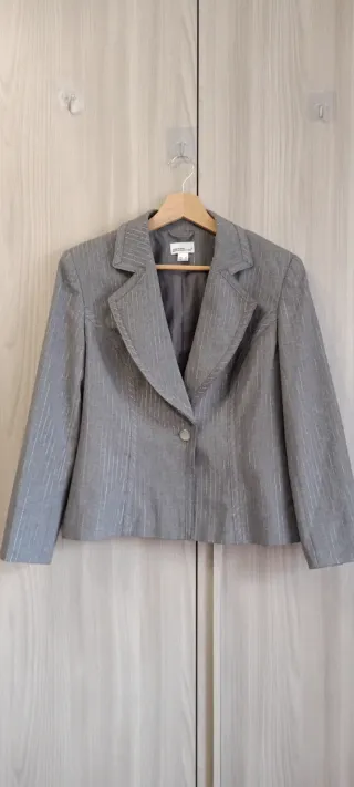 Giacca elegante con un classico motivo gessato. Un capo versatile per un look sofisticato. - Design monopetto con un bottone. - Scollo a V con revers. - Maniche lunghe. - Taglio sartoriale che valorizza la figura. 📏 Misure (prese in piano): Spalle: 40 cm Torace (ascella-ascella): 49-50 cm Lunghezza manica: 58 cm Lunghezza totale: 51 cm