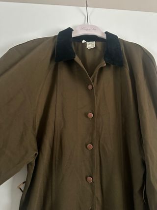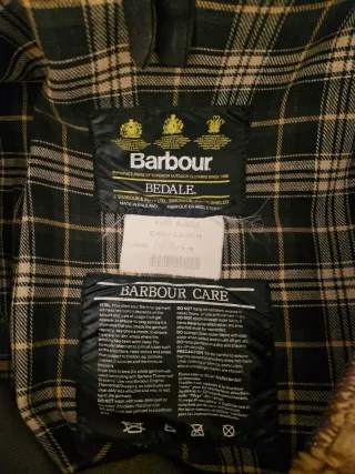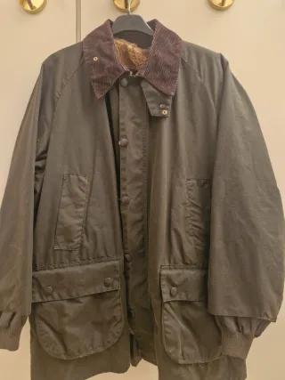 Giacca cerata Barbour modello Bedale vintage, codice A100, taglia C42/107CM. La giacca è di colore verde (sage) con fodera interna a quadri scozzesi. Caratteristiche principali: Marca: Barbour. Modello: Bedale, uno dei modelli iconici del marchio, noto per la sua versatilità e il design ispirato all'outerwear britannico. Taglia: C42, corrispondente a una taglia L o XL italiana, con circonferenza torace di 107 cm. Materiale: È realizzata in cotone cerato per offrire protezione da vento e pioggia. Design: La giacca presenta un design iconico, originariamente pensato per i fantini, con una lunghezza a metà coscia e spacchetti laterali