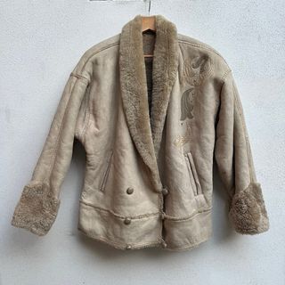 Montone vintage da donna in vera pelle scamosciata con interno in lana/shearling, molto caldo. Colore beige, dettagli decorativi sul davanti e collo ampio. Taglia riportata M, vestibilità oversize. Buone condizioni, normali segni del tempo.