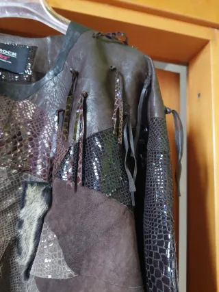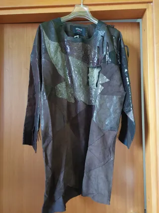 Un capo unico in pelle, perfetto per un look audace. - Design patchwork con diverse texture. - Dettagli sfrangiati sulle maniche e sul collo. - Materiale principale in pelle. - tasca in montone - maniche a pipistrello, linea dritta - linea "Frock - from trash to treasure" - capi non ripetibili - vita 54 cm - lunghezza 84 cm Capo eseguito, non indossato, invenduto. Dettagli in foto