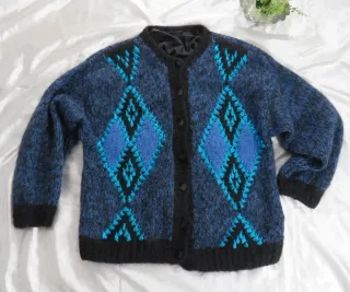 Splendido cardigan vintage lavorato a mano 100% pura lana, caratterizzato da un vivace motivo argyle/losanghe nei toni del blu, celeste e nero. Condizioni: Ottime condizioni vintage senza alcun difetto Vestibilità: Oversize, comoda e calda, perfetta per un look autunnale/invernale. Ideale da indossare aperto o abbottonato. Misure: Spalle: 60cm Ascelle:56 cm Lunghezza: 67 cm Dettagli: Bottoni neri classici, lavorazione a maglia spessa.