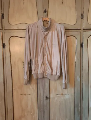 Giubbotto vintage in puro camoscio con bottoni. Vero camoscio morbidissimo con reverse in cotone ai polsi e all'estremità inferiore. Presenta delle lievissime ombreggiature soprattutto sul davanti, per ulteriori informazioni chiedetemi pure delle foto.