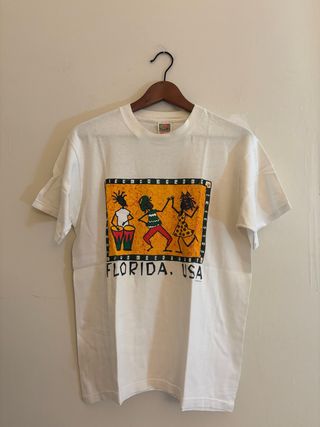 Autentica t-shirt vintage anni ’90 bianca con stampa grafica colorata a tema caraibico/tropicale — figure danzanti e bonghi su sfondo arancione con cornice decorativa, scritta “Florida, USA”. Brand Fruit of the Loom Heavy Cotton, 100% cotone preshrunk, taglia M. Il design e l’etichetta sono tipici dei souvenir americani degli anni ’90, molto ricercati dai collezionisti vintage.