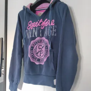 Felpa con cappuccio da donna del marchio Spitfire. - Colore blu con dettagli rosa. - Stampa Spitfire Vintage sul davanti. - Logo circolare Spitfire Co. Seattle Estab 1974 sul petto. - Tasca a marsupio. - Cappuccio con laccetti. - polsi un po' rovinati
