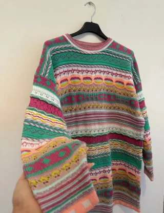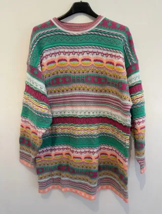 Maglione da donna vintage con un vivace design a righe e motivi geometrici. - Lavorazione a maglia con dettagli traforati. - Maniche lunghe. - Scollo rotondo. Usato ma in ottime condizioni.