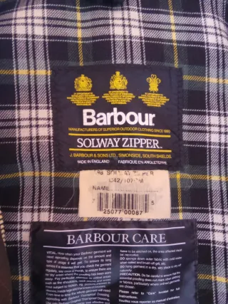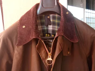 Giacca Barbour in stile vintage, mai usata. Un capo classico e intramontabile. - Tessuto cerato resistente. - Fodera interna a quadri. - Colletto in velluto a coste. - Chiusura con zip dorata.