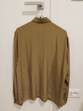 Camicia vintage dal taglio classico, color cachi. Non presenta difetti. Materiale: poliestere - Tessuto satinato. - Colore verde oliva. - Maniche lunghe con polsini. - Chiusura con bottoni.
