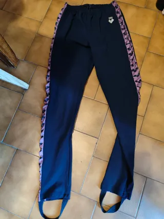 Leggings vintage de la marca Arena en color azul. Presentan un diseño con una raya lateral decorativa. - Raya lateral con estampado. - Diseño con tiras en los tobillos.
