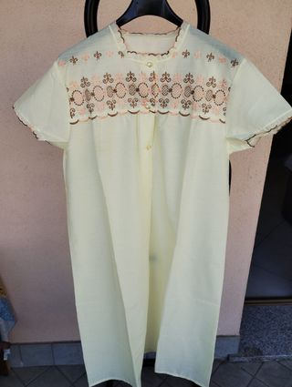 Camicia da notte con ricami Vintage Italy taglia M Lunghezza cm 100 Spalle cm 40 Da ascella ad ascella cm 50 100% cotone Manica corta, colletto alla coreana ricamato, bottoni frontali. Bellissima camicia da notte vintage in cotone leggero, color panna/crema. Il pezzo forte è lo splendido ricamo a contrasto sul carré nei toni del marrone e corallo, con eleganti motivi a giglio e geometrie classiche. Presenta una lavorazione a punto smerlo (festonato) rifinito a mano su tutto il colletto e sull'orlo delle maniche corte. Chiusura frontale con bottoni madreperlati. Un capo fresco, romantico e senza tempo. #vintage #italy