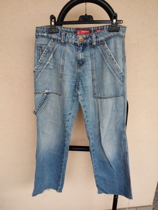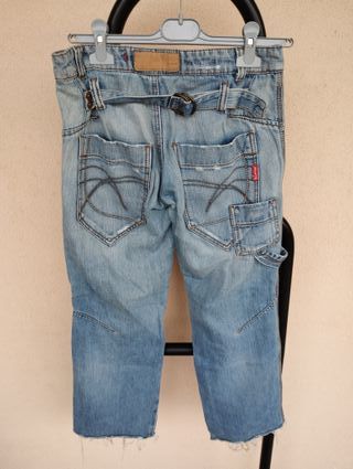 Jeans Phard Vintage Y2K - Modello Carpenter Taglia S Lunghezza cm 87 Vita cm 38 Splendido paio di jeans Phard originali, in perfetto stile vintage anni 2000 (Y2K). Il modello è molto particolare, un incrocio tra un jeans cargo e un carpenter, caratterizzato da: Lavaggio medio con effetto leggermente vissuto. Tasche frontali grandi a contrasto e taschino laterale porta-attrezzi. Dettaglio posteriore: Cinturino regolabile sulla schiena con fibbia in metallo e ricami iconici sulle tasche. Fondo a taglio vivo (originale o personalizzato) per un look più urban/distressed. Gamba dritta, leggermente ampia. #Phard #VintageJeans