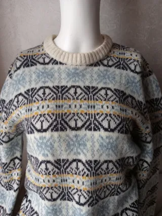 Pullover girocollo con motivo jacquard multicolore. 100% pura lana. Condizioni molto buone, presenta dei pelucchi rimovibili con un po' di pazienza. Taglia M. Made in United Kingdom.