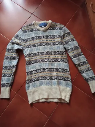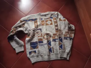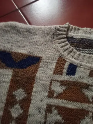 Maglione invernale con motivo jacquard. Addatto a tutti i sessi. Colore principale panna/beige con decorazione marrone e kaki. Nella foto indossato da uomo. Taglia S da uomo, vestibilità slim e soprattutto colletto stretto. Usato qualche volta ma in condizioni buone/ottime. Manca l'etichetta del tessuto (dovrebbe essere lana/acrilico). - petto 54 cm - lunghezza (centro schiena, partendo da sotto il colletto) 68/69 cm