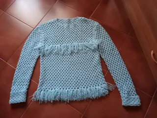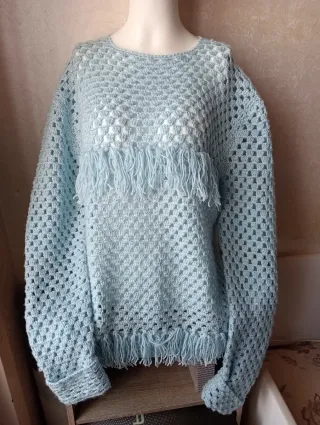 Pullover in maglia larga con frange. Lavorazione all'uncinetto. Condizioni eccellenti. Taglia unica, da L a XXL circa. Verificare misure in centimetri. Produzione artigianale italiana. - spalle 52/54 cm - petto 50/52 cm - lunghezza (centro schiena) 64 cm - manica 66 cm