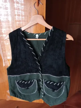 Gilet 100% lana con tessuto misto, parte effetto velluto nero e parte pied de poul verde scuro con finiture a vista. Condizioni ottime. Taglia unica (direi adatto da M a XL), si raccomanda di verificare le misure in centimetri. - spalle 32 cm - petto 48 cm - lunghezza (centro schiena) 50 cm