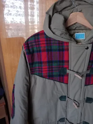Giubbotto patchwork imbottito in cotone 35 e poliestere 65. Parte "liscia" color tortora e parte in tessuto fantasia tartan. Condizioni generali eccellenti. Difetti: un alamaro è scucito; un tratto sembra sbiadito se visto controluce. Taglia M, vestibilità oversize. - petto 62/63 cm - lunghezza (centro schiena) 87 cm