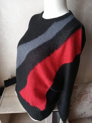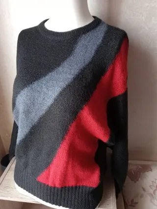Maglioncino in tessuto caldo (molto probabilmente 50 lana 50 acrilico). Chiusura colletto a bottoni e fiore jacquard sul petto colore rosa su sfondo melange di blu/viola-lilla/rosa. Condizioni ottime. Taglia L, si raccomanda di verificare le misure in centimetri. - spalle 56 cm - petto 56 cm - lunghezza (centro schiena) 62 cm - manica 42 cm