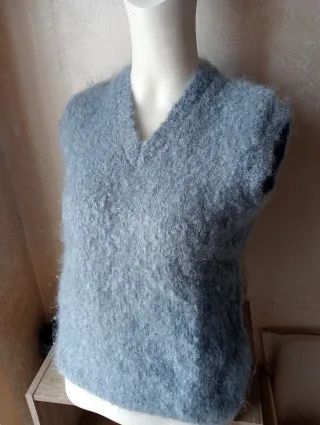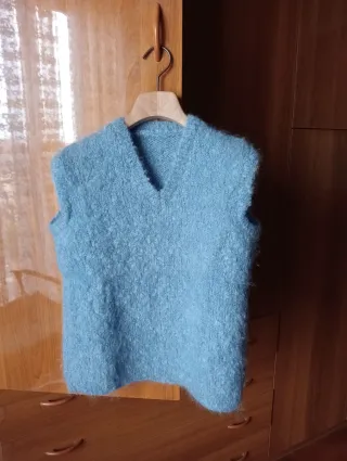 Maglioncino smanicato con scollo a V. Ottime condizioni. Colore celeste. Taglia S/M, verificare misure in centimetri. - saplle 40/42 cm - petto 46 cm - lunghezza totale (centro schiena) 56 cm