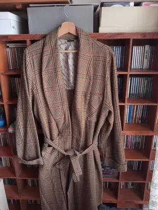 Soprabito da camera in tessuto caldo (lana 70 poliestere 20 e nylon 10) con motivo a quadri in bouquet di colori invernali (kaki, senape, beige, marrone, carota). Condizioni ottime. Taglia 52. Made in Italy. Privè pour l'homme.