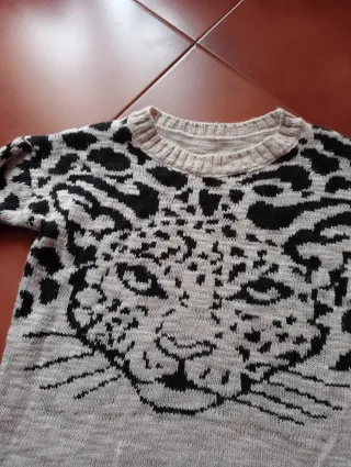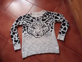Pullover girocollo con disegno felino e motivo maculato animalier. Tessuto misto lana 10 viscosa 10 alpaca 5 acrilico 75. Condizioni ottime. Taglia L. Made in Italy. - spalle 58 cm - petto 54 cm - lunghezza (centro schiena) 60 cm - manica 52 cm
