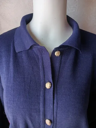 Maglia/cardigan in misto lana e acrilico. Bottoni metallici dorati. Condizioni eccellenti, unico difetto: lieve apertura del tessuto (NO buchi, vedi ultima foto). Taglia L. Made in Italy. - spalle 50 cm - petto 62 cm - lunghezza (centro schiena) 59/60 cm - manica 50 cm