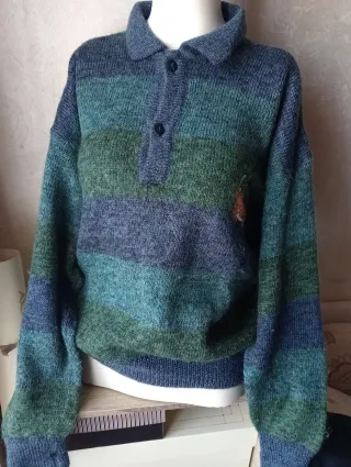 Stupendo maglioncino a righe con stambecco in stoffa sul petto. Tessuto misto lana 90 e kid mohair 10. Colori verde/verde acqua/blu. Condizioni generali eccellenti ❗ purtroppo presenta un buchino visibile in foto. Taglia M. Made in Italy. Mafra. - spalle 55 cm - petto 56 cm - lunghezza (centro schiena) 57 cm - manica 51 cm