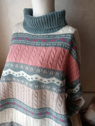 Maglione collo alto misto lana/acrilico. Motivo della maglia a trecce e jacquard. Fantasia a righe e figure geometria multicolore. Abbastanza usato ma senza difetti gravi. Taglia L. - spalle 56 cm - petto 56 cm - lunghezza (centro schiena) 66 cm - manica 48 cm