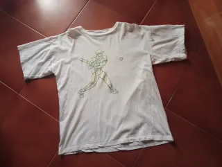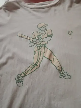 Maglietta girocollo in cotone. Stampa gommata sul davanti a tema baseball. Abbastanza usata, condizioni generali ottime ma non perfette. Una macchiolina dove indicato. Taglia M/L. Made in Italy. Missoni Sport. Vintage - spalle 60 cm - petto 58 cm - lunghezza (centro schiena) 63 cm