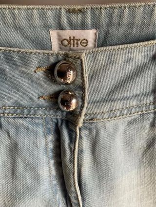 Jeans chiari da donna del brand Oltre, modello vintage. Colore azzurro chiaro con sbiaditure. In ottime condizioni, piccoli strappi originali. Indossato poco. Piastrina con logo sulla tasca. Tg 44, foto con misure. - Tessuto denim poco elasticizzato. - Dettagli con bottoni metallici. - Vita media.